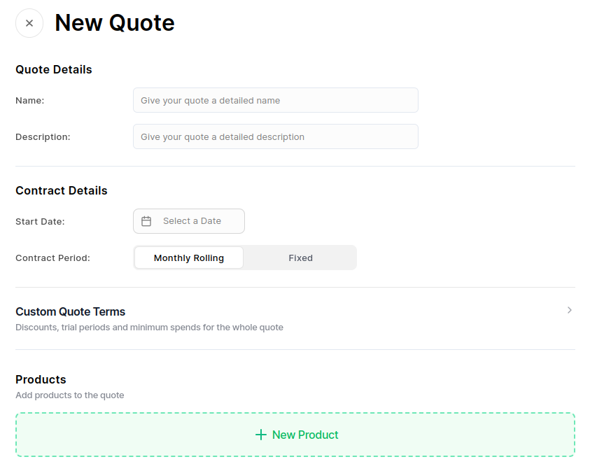 - Minimum Spend: Set a minimum spend that the customer must reach during each billing period, regardless of their usage. This ensures a base revenue for the Quote.